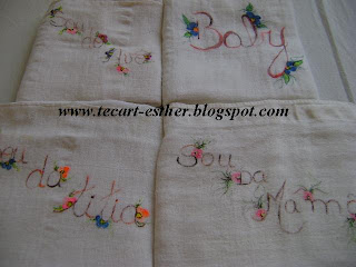 Esta última foto as fraldas com dizeres não levam demão de tinta branca e elas são escritas a pincel. As flores foram feitas girando o pincel a 360º e as folhas pintadas sem riscar para dar leveza ao trabalho.